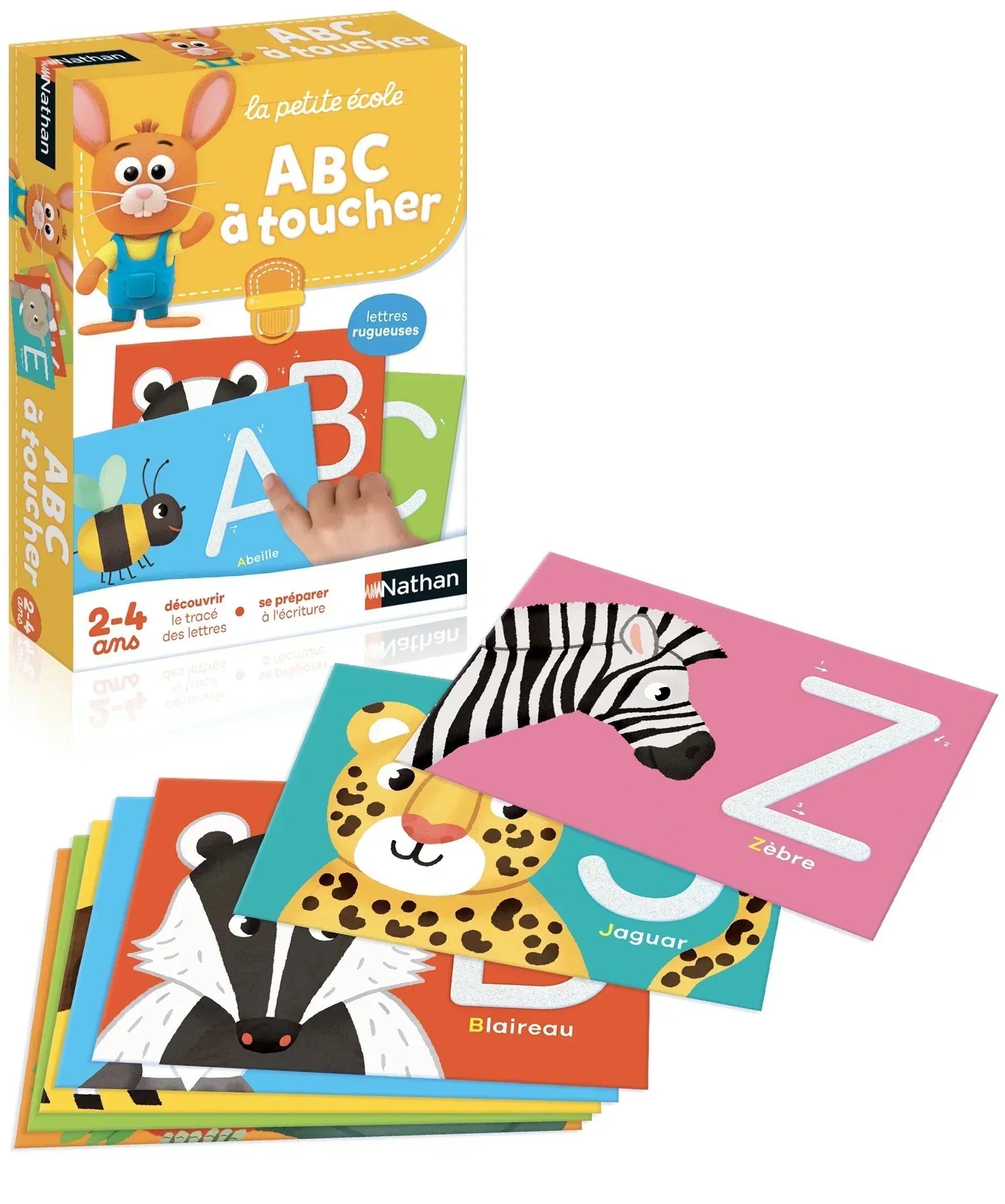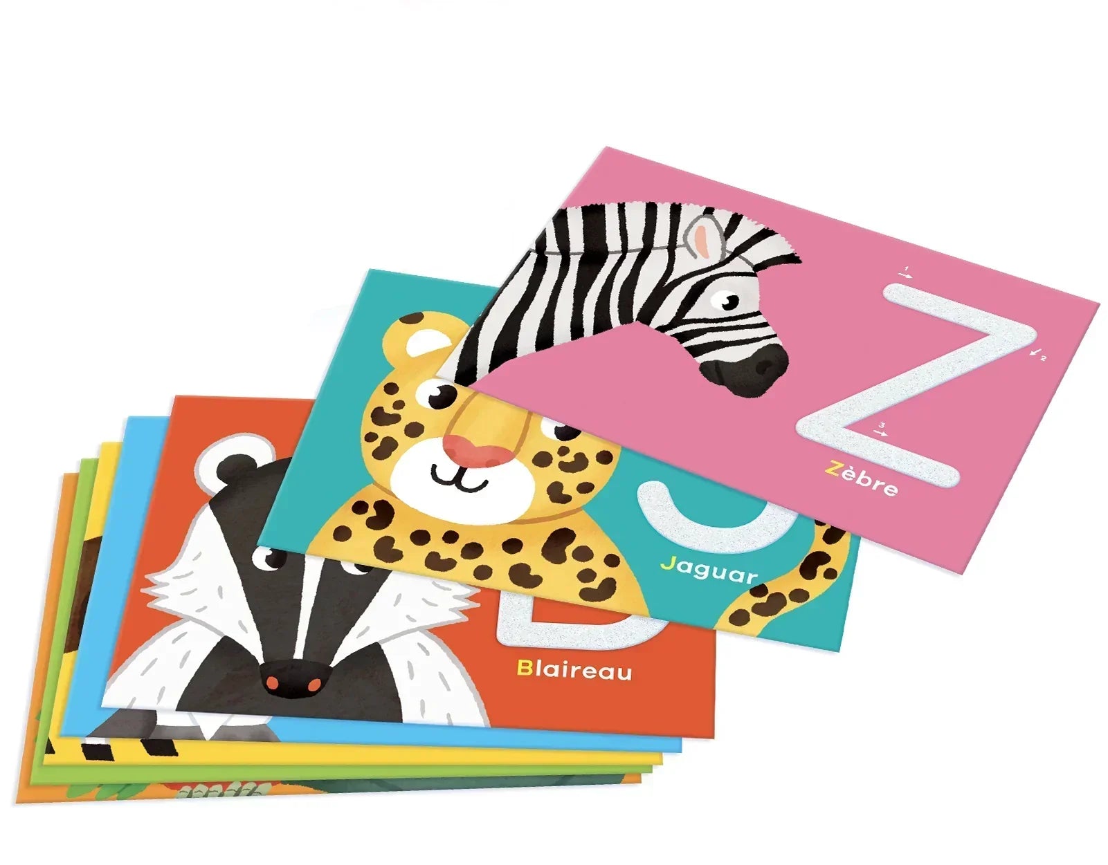 6 jeux progressifs pour découvrir les lettres et l'alphabet. De grandes cartes avec les 26 lettres rugueuses magnifiquement illustrées sur le thème des animaux. L'enfant part à la découverte de l'animal, puis de la lettre majuscule:" Abeille, c'est le A de l'abeille". Il observe la lettre, suit le tracé avec son doigt. L'enfant se prépare tout en douceur à la lecture et à l'écriture.