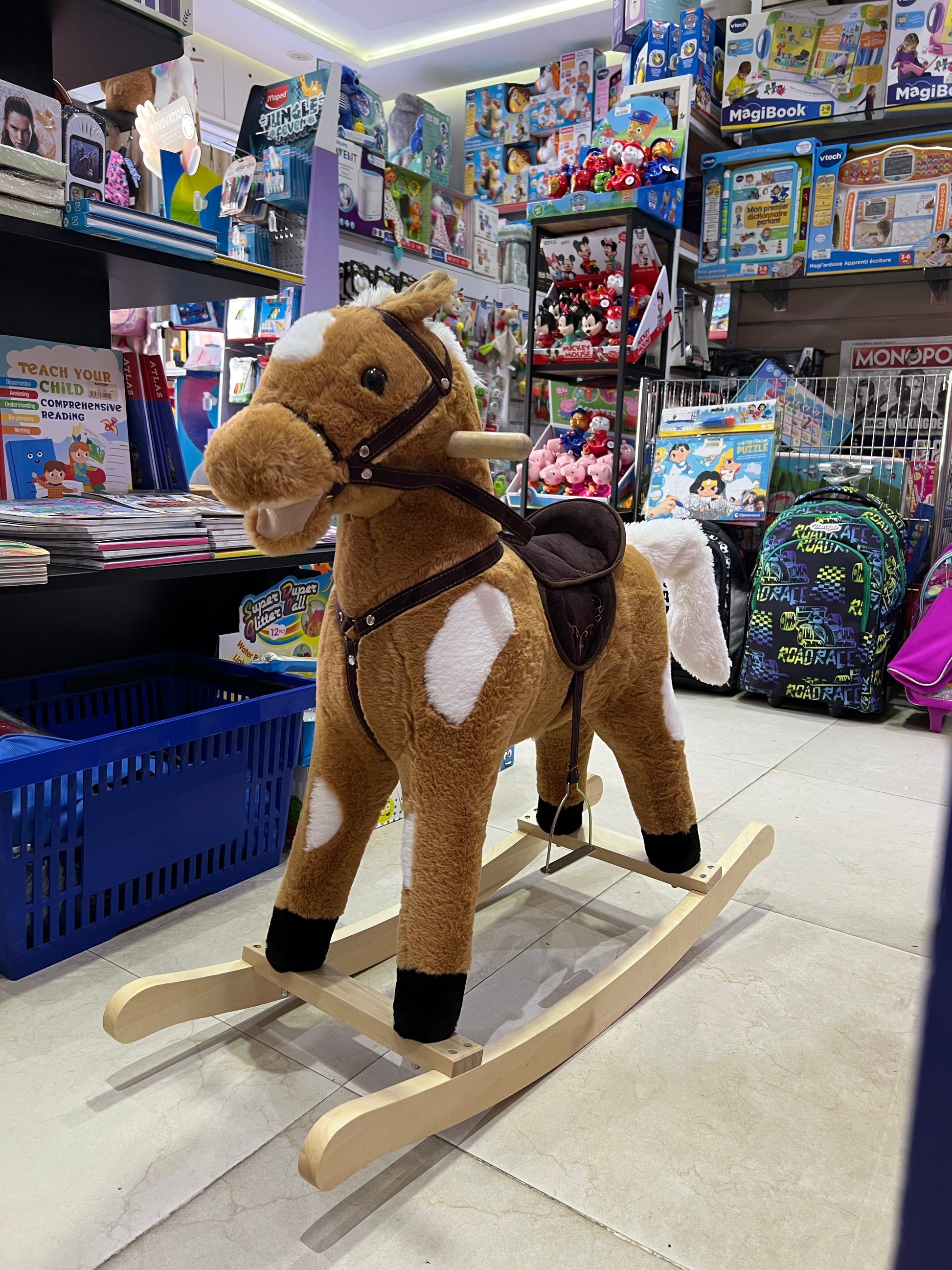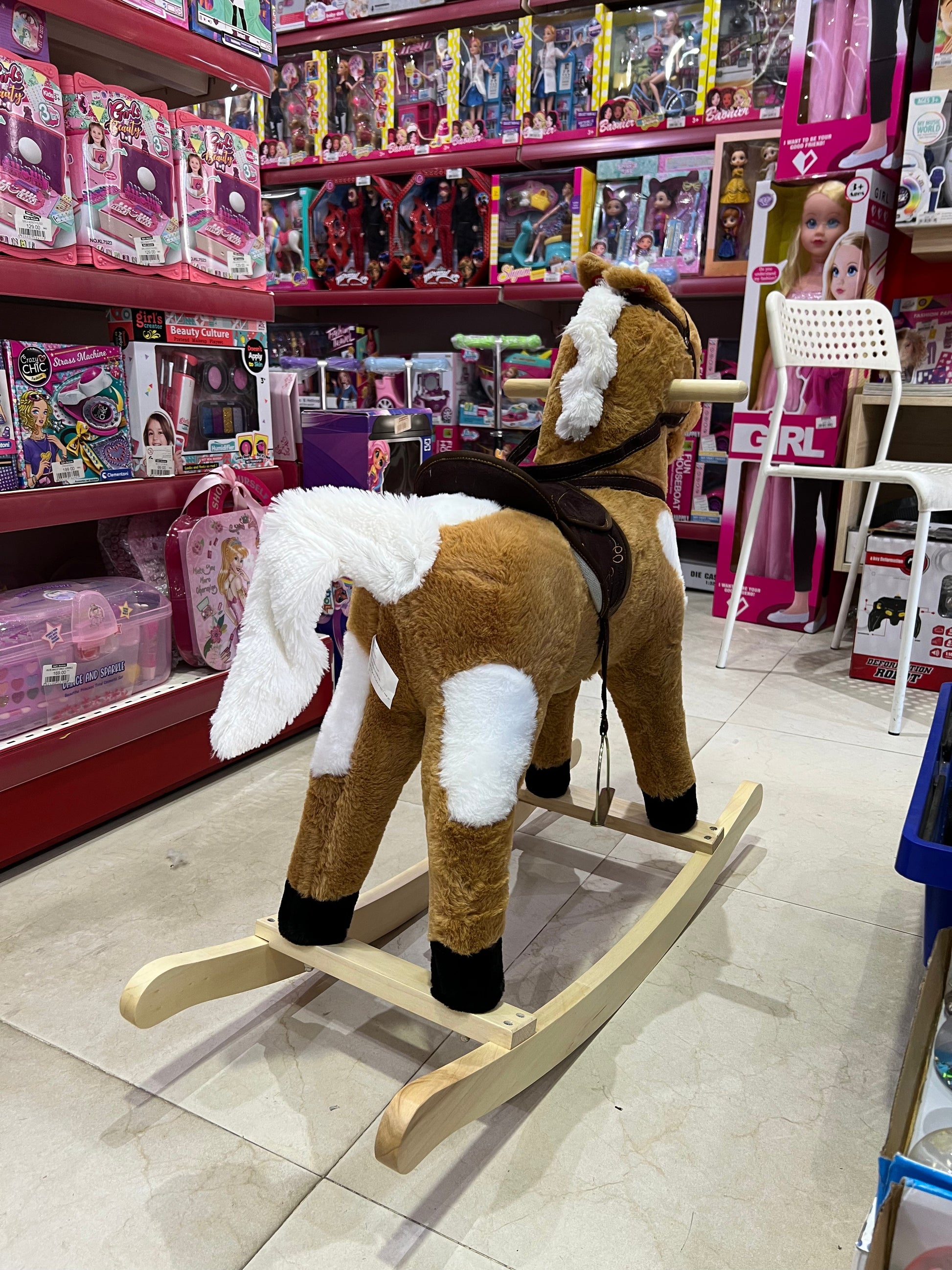 Magnifique cheval sur un cadre robuste en bois, pour balancer en toute sécurité.Un beau cadeau pour les enfants. Il emet de belles chansons et lumières pour la joie des petits avec queue,crinière, selle rembourrée souple et harnais, une base en bois pour la solidité et la durabilité et des poignées latérales pour plus de sécurité.