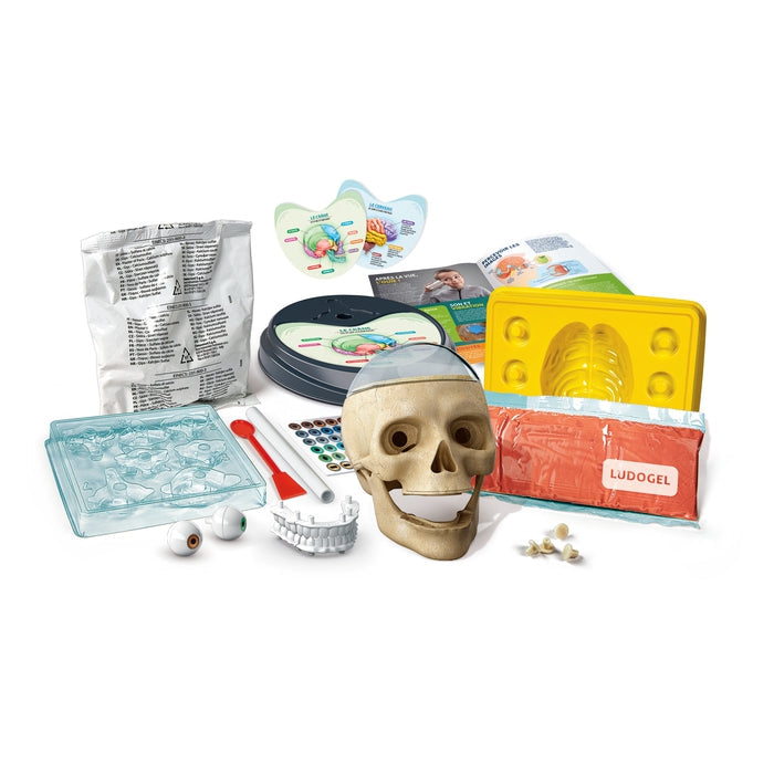 Un crâne à assembler, deux hémisphères cérébraux, des dents, des globes oculaires et de nombreux éléments à toucher et à manipuler comme s'ils étaient réalistes, pour une expérience de jeu encore plus amusante.