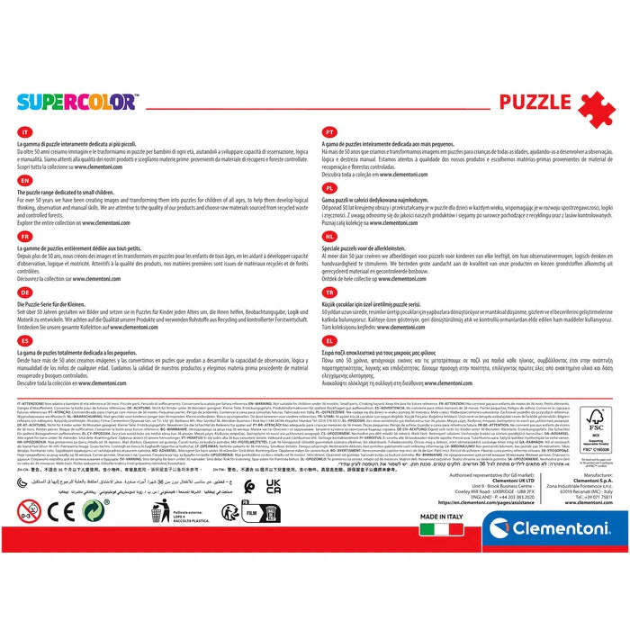 Depuis toujours sensible au problème de l’écologie, Clementoni utilise beaucoup de matériaux recyclés, évitant l’emploi de composants polluants. Made in Italy.