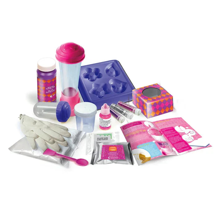 Le jeu contient tous les matériaux et instruments requis pour réaliser plein d’expériences et créations originales comme la Lampe à paillettes, des objets décoratifs en plâtre et du slime scintillant.