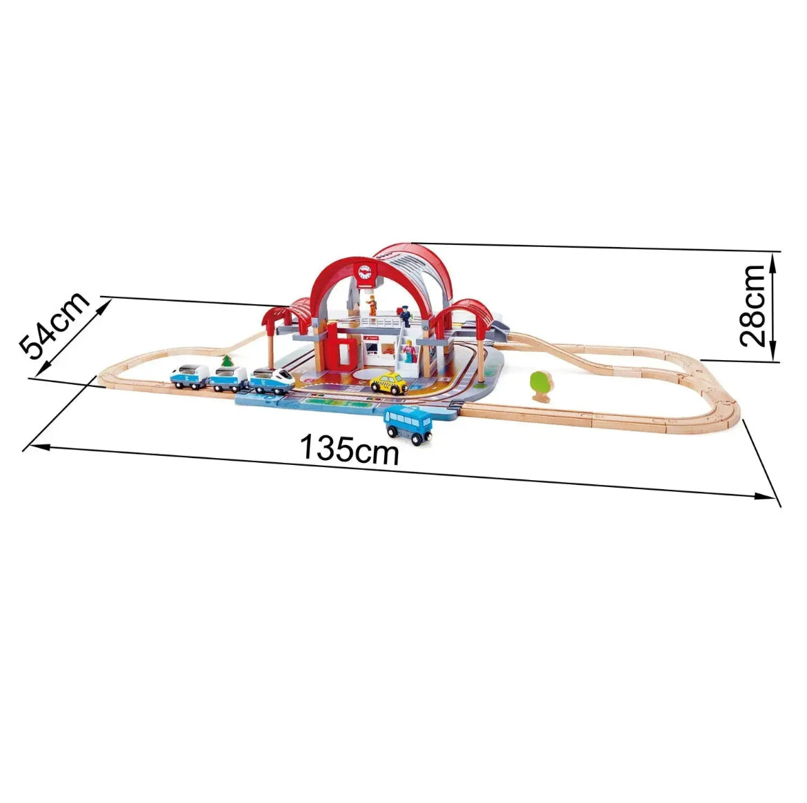 - Inclut un train à grande vitesse à trois wagons, un taxi et un bus ; la locomotive et les wagons s’ouvrent pour accueillir des figurines et des bagages
