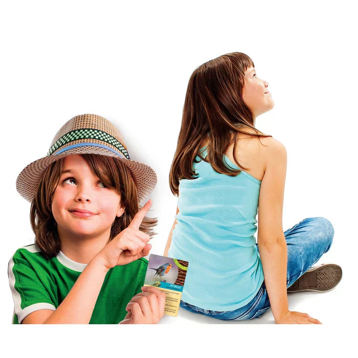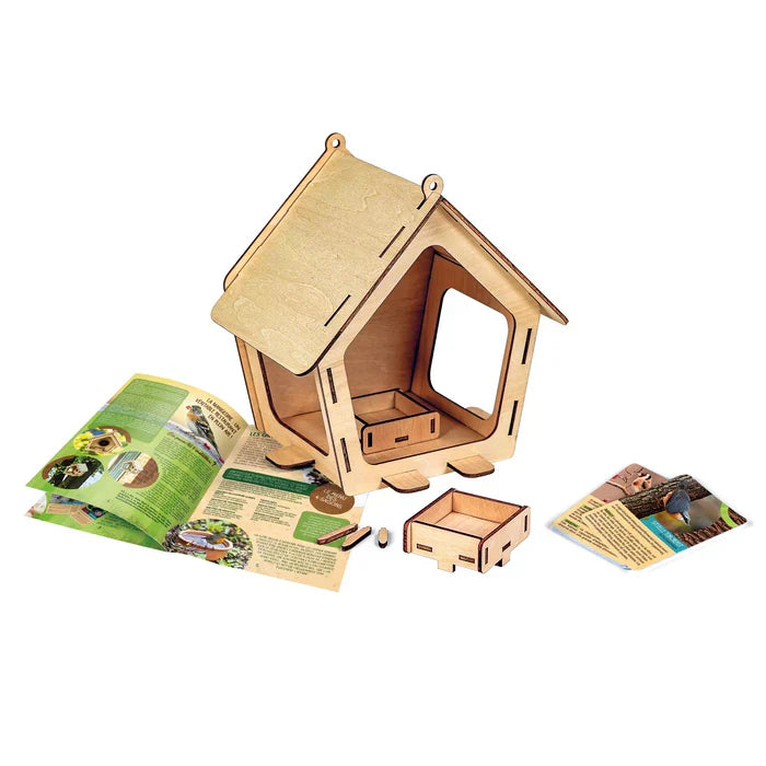 Le coffret contient une mangeoire en bois à assembler, des cartes pour reconnaître les différentes espèces d'oiseaux et des graines spéciales pour les nourrir tout au long de l'année !