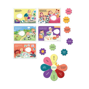Contient 8 scènes sur des cartes recto-verso avec des situations de la vie quotidienne familières à l'enfant : au recto une image évocatrice et au dos une comptine dont il manque le dernier mot.