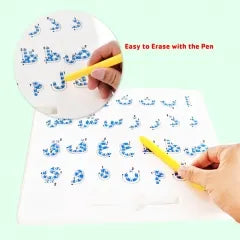 Une méthode amusante et efficace pour enseigner aux enfants les lettres arabes de manière rapide et facile. Ce jeu développe les compétences en écriture des enfants et les aide à bien tenir le stylo avec un stylo magnétique : il suit le tracé de la lettre et aide à former la lettre correctement. Le tableau d'écriture est dessiné avec des lettres arabes découpées par de petites ouvertures contenant des billes métalliques. En faisant passer le stylo magnétique, les billes sont attirées vers le haut pour dessiner la lettre de manière jolie.