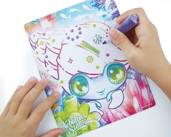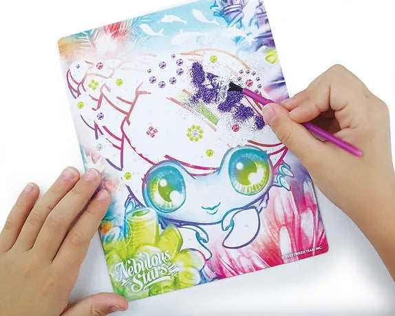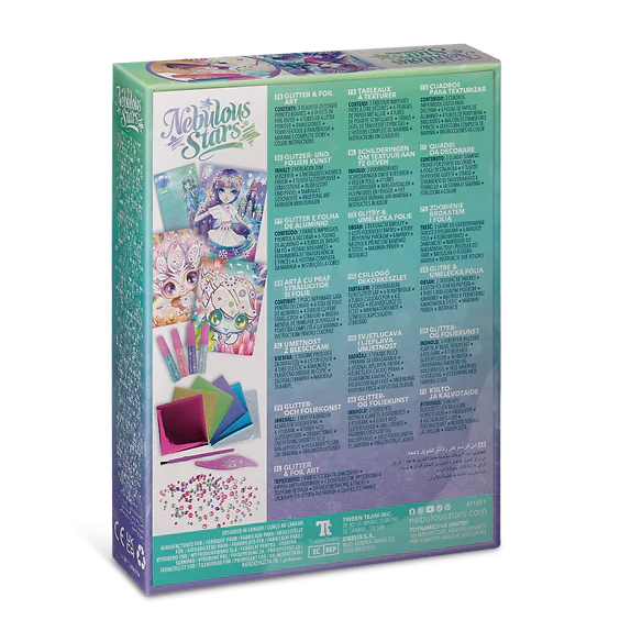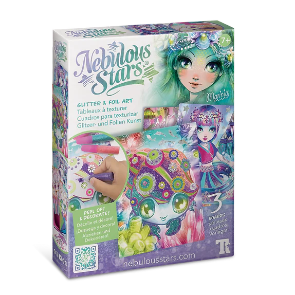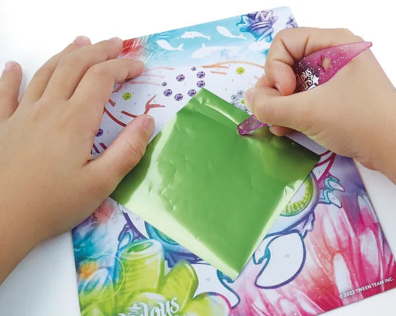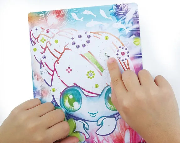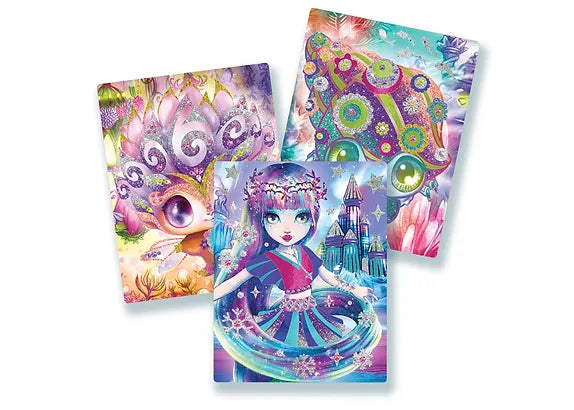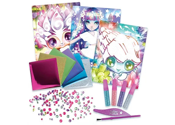 Crée des chefs-d'œuvre étincelants avec une méthode simple et efficace. Retire les pièces pré-coupées pour décorer chaque partie avec un papier métallisé, de la poudre scintillante et des strass.